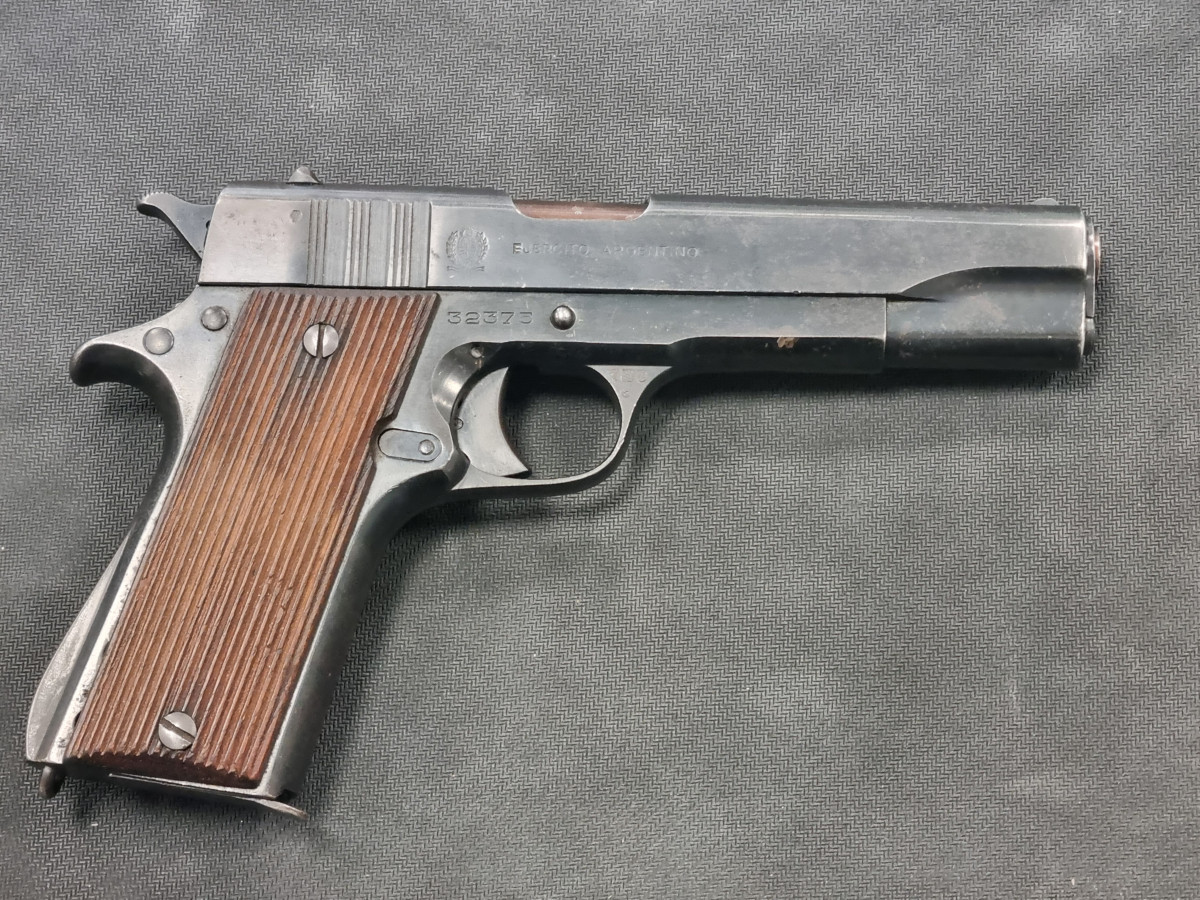 Argentinská klon slavné pistole 1911 v ráži .45 AUTO. Velmi dobrý stav, původní povrch, sčíslovaná, platná zkušebna.