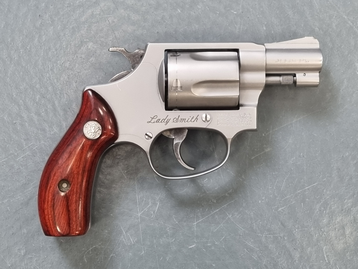 Celo ocelový revolver S&W Lady Smith na 5 ran ráže .38 Special. Velice dobrý stav, čistý lesklý vývrt. Ke zbrani původní textilní pouzdro na přepravu, zbytek střeliva, speed loader.